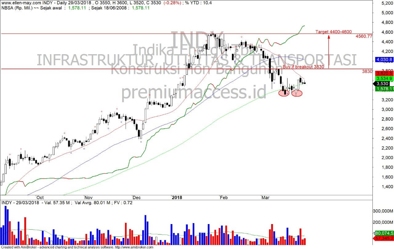 Pola pergerakan sahm INDY saat ini sudah memotong trend uptrend-nya dan lebih berpotensi untuk turun. Namun, jika berhasil menembus level 3830, maka INDY masih berpotensi kembali menguat.