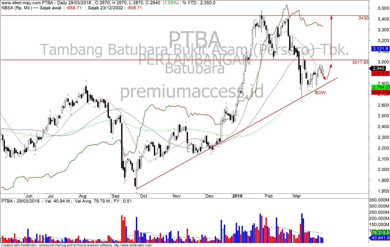 Setelah mengalami penurunan yang cukup tajam, PTBA berpotensi mengalami rebound. Jika Anda ingin membeli saham ini, Anda bisa melakukan Speculative buy on weakness, di level 2750-2950, stop loss maks loss di 2680, target 3100, 3400. Jika berhasil menguat di atas 3100, potensi menguji kembali 3400.